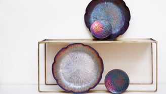 Psychedelia by Amy O’Conner is a design collection of handmade vases and other household items. O’Conner’s distinct glass finish brings a unique flair to each item, making them beautiful objects that won’t just gather dust on the mantelpiece. This set was photographed to celebrate the 15 year anniversary of the Psychedelia series.